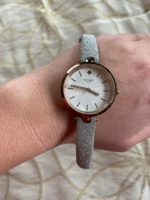 This is my first Kate Spade watch purchase. I’m impressed with the design. It says it has genuine leather. Such a charming watch! It doesn’t look rose gold in person though just what you see in the photo but I’m still happy with this purchase. I also bought this when it was on sale for 50% off.
