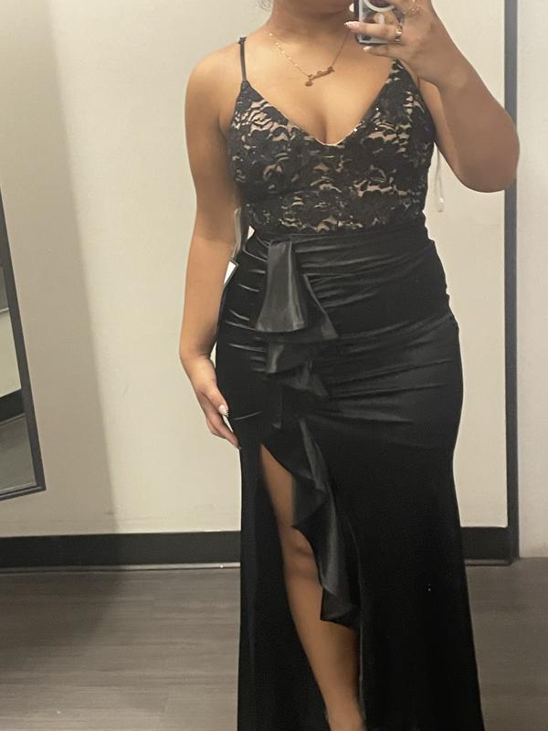 Very disappointed in the top of the dress as the tan lining in the front V up through the straps was showing and I could not get the lining to stay below the stitching of the black over it, which was quite embarrassing that it was sticking out at the fancy wedding I just attended