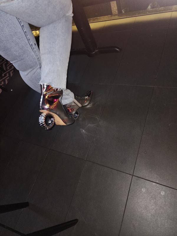 The Linksy Bootie by Katy Perry is fashioned with a soft square toe and boosted by a sculpted electroplated watch-chain heel.
