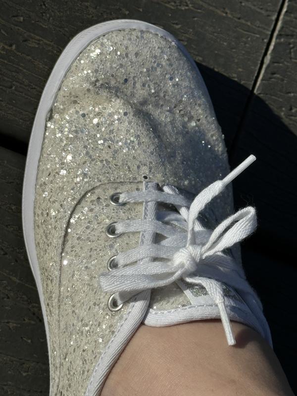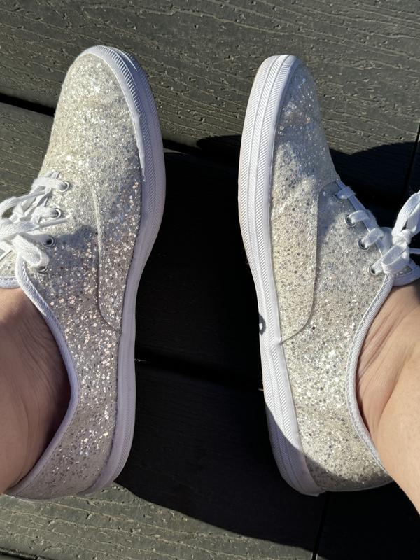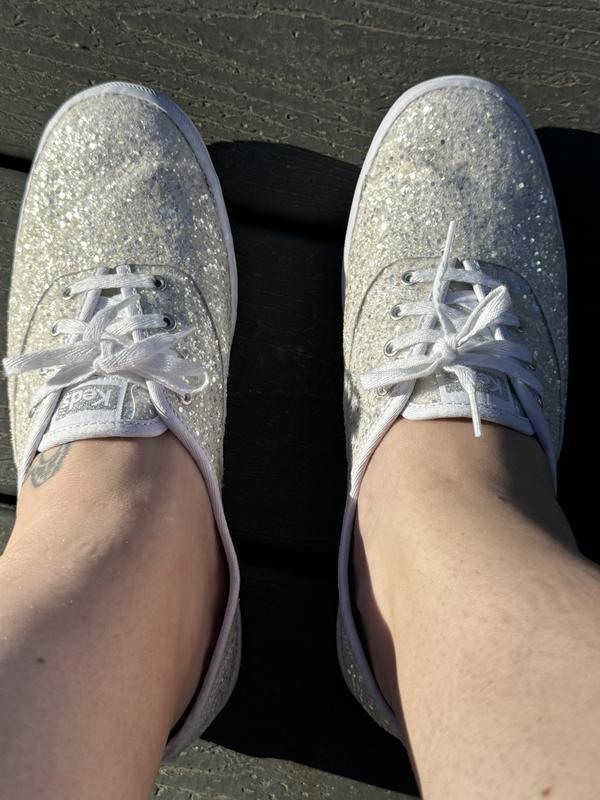 I hesitated on getting these because of all the bad reviews. I am so glad I did get them! The opening of the shoe, where you put your foot into, is lined with a white material that has no glitter on it, so there's no glitter in contact with any skin. The shoe may be marginally stiffer than a plain, material pair of Keds, but it's nothing I would have noticed except that I was on alert after all the negative reviews. The day I got them I wore them for a full day with no problems. I absolutely LOVE the sparkles! The only weird thing is that I'm an 8.5 in all other shoes....even my other pair of Keds. But the 8.5 in this style was HUGE. I returned those for a 8 and they are absolute PERFECTION!!