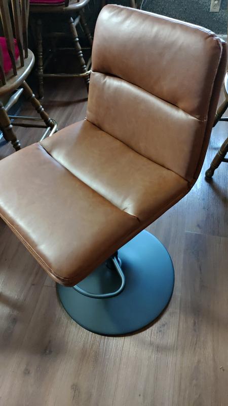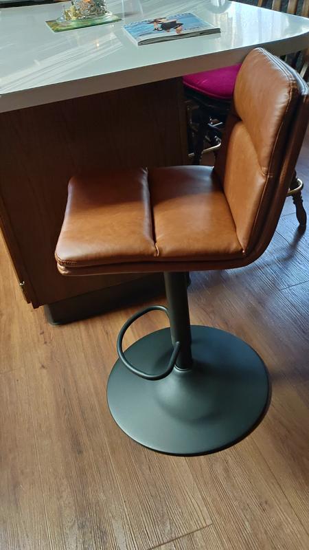 These stools are the perfect addition to my home. The black leather-like upholstery fits right in with the design of my kitchen/dinette and the seats are very comfortable. The fact that they swivel 360 is also a great feature and they will also be easy to clean. In addition, I like the fact that the height can adjust from counter to bar height, should I ever decide to move to a different area. Assembling them was also quite easy to do.