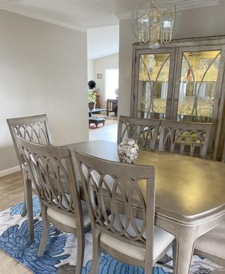 Wow!!! I love this gorgeous dining room set by Kelly. I do have a problem with a few nicks that my cleaning ladies are done. What do you suggest to touch up the nicks?