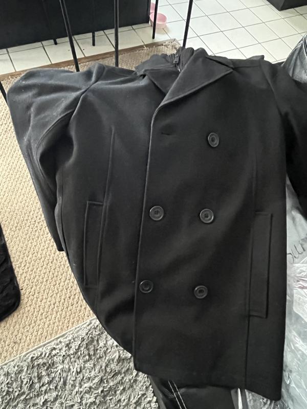 Peacoats are typically made of a woolen material that goes with both casual or nicer dress. This material surface is one of formal wear, and will seem out of place when worn with casual clothes. Will have to return. Otherwise, very nice.