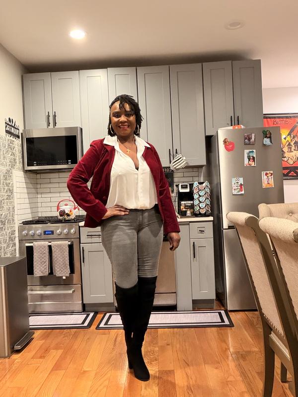 Beautiful boots that cover the knee completely. Comfortable. Can be styled casual or dressy for multiple occasions. Very pleased with these over the knee boots.
