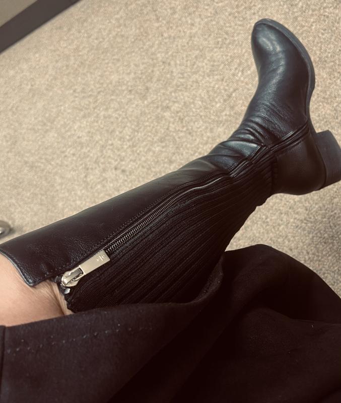 I bought these four years ago, and they’ve held up beautifully. The quality is excellent—yes, they’re a bit spendy, but definitely worth it. I have medium-width calves, and the stretchy panel hugs nicely without feeling tight. If you have slimmer legs, these will fit great too, without that wide, gapping look many boots have. I love wearing them with dresses and skirts!