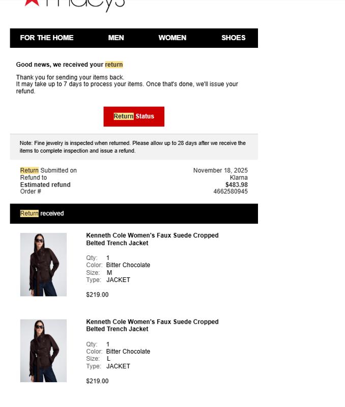 Macys has been trying to get away with stealing the entire value of this jacket from me. I purchased it online in November 2025 in size M and L, order number 4662580945, return submitted for both sizes 11/18/25. Macy's confirmed receipt of BOTH jackets and tracking from the label shows they were received as well. Both jackets were in the same box. Macys have refunded me for a SINGLE jacket and have refused to refund me further, I have spoken to customer service on the phone twice and been told "it's in process". I have never dealt with something so infuriating in my life.