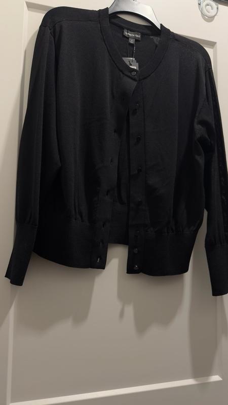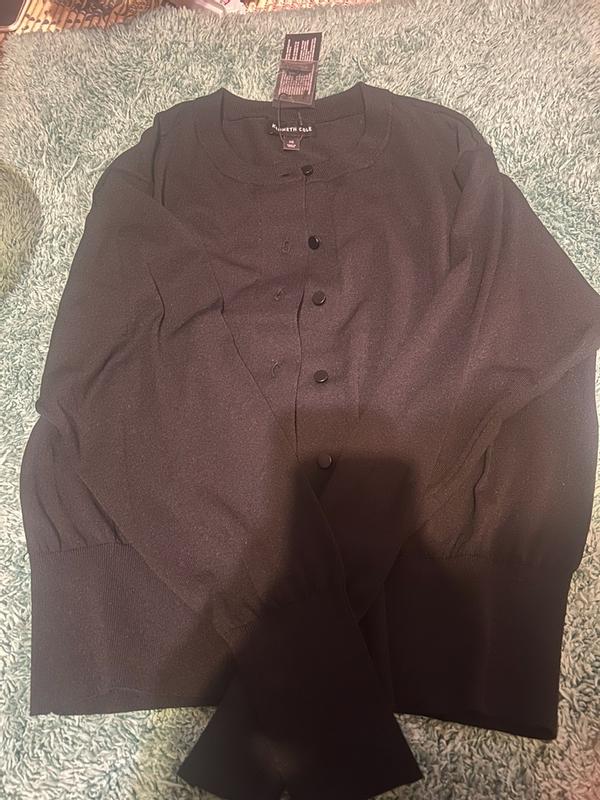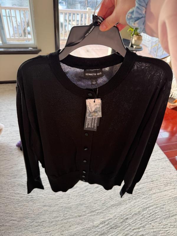 Kenneth Cole woman’s long sleeve button front sheer cardigan sweater. Is nice and stylish. Looks nice on is light weight. Fills soft to the touch.