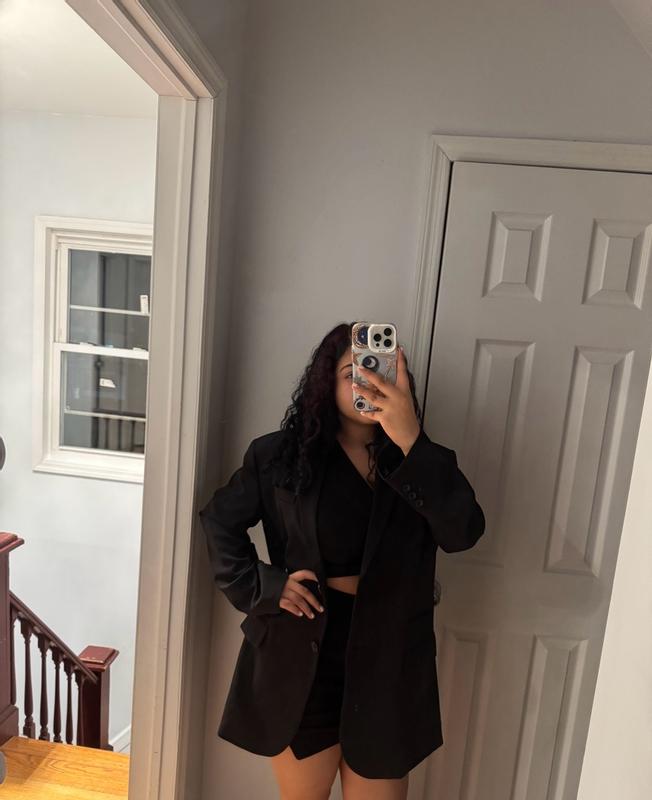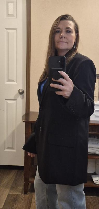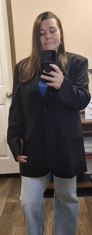 A great oversized women’s blazer. Great to pair with anything as a black top. Can dress up or down with some jeans. Fits well without being too heavy.
