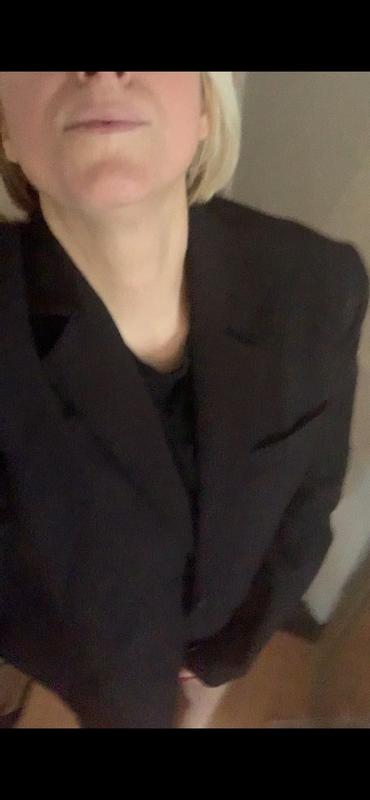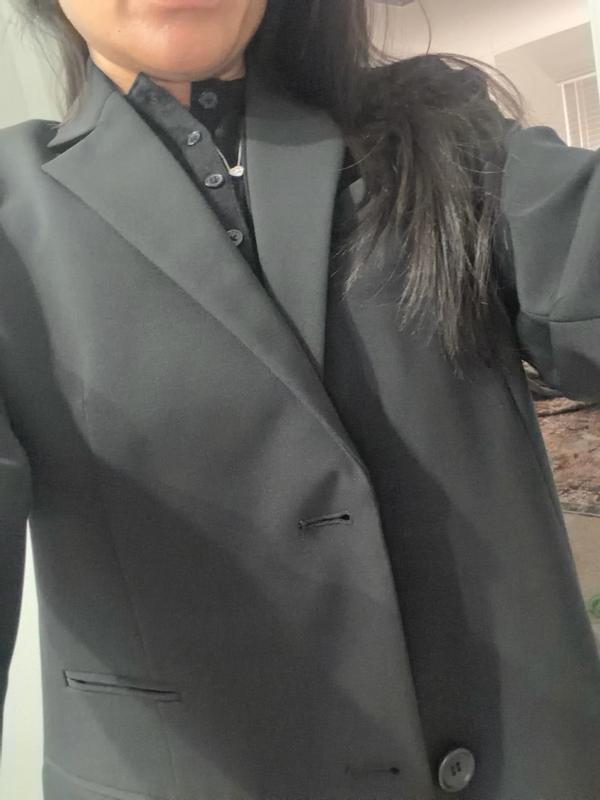 Kenneth Cole Women’s Luxe Twill Two Button Boyfriend Blazer in an XL (I normally wear a size 16). The overall design is classic and polished, making it easy to dress up or down. The two-button front adds a tailored look without feeling stiff, and the buttons themselves feel well made. The blazer does have light shoulder pads. I was a little unsure at first, but they actually weren’t bad at all—they helped give the blazer structure without looking overly boxy. The fit through the chest was more fitted than loose (I’m a 38H), so it didn’t have that oversized boyfriend feel on me, and it also wasn’t as long as I expected based on the description. What really stood out was the texture and comfort. The inside is incredibly soft, and the fabric feels smooth and luxe against the skin. It was super comfortable to wear for an extended time—I even wore it out in Vegas—and I never felt restricted or uncomfortable. Overall, it’s a stylish, comfortable blazer with great fabric quality, just keep sizing and fit in mind if you’re fuller in the chest or expecting a very oversized look.