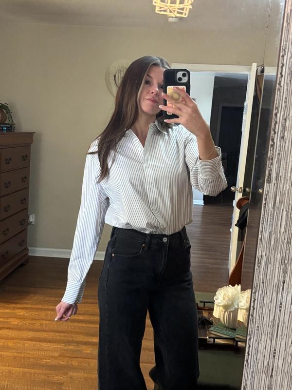 Okay! I’m not usually one for a pinstripe moment, but this Kenneth Cole Pinstripe Button Down Shirt has changed my mind! How cute is it with some wide leg jeans?! Loving this for a casual bit dressy office outfit! So cute, love that the sleeves are a little more fitted and the body has that cute oversized (but not too much) look. Great quality, love it!