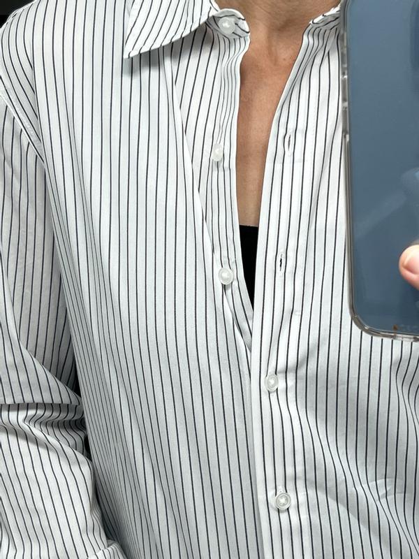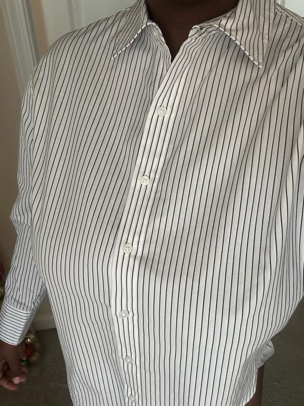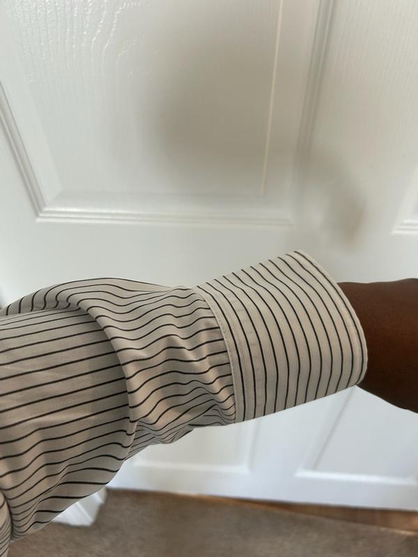 This is such a classic, polished piece. The cotton fabric feels crisp yet comfortable, making it easy to wear all day. The pinstripe design is timeless and works perfectly for both work and casual looks. I love how the fit is flattering without feeling too tight or boxy, and the flip cuff detail adds a subtle, modern touch. It pairs beautifully with trousers or jeans and instantly elevates any outfit. A great wardrobe staple I’ll be reaching for often.