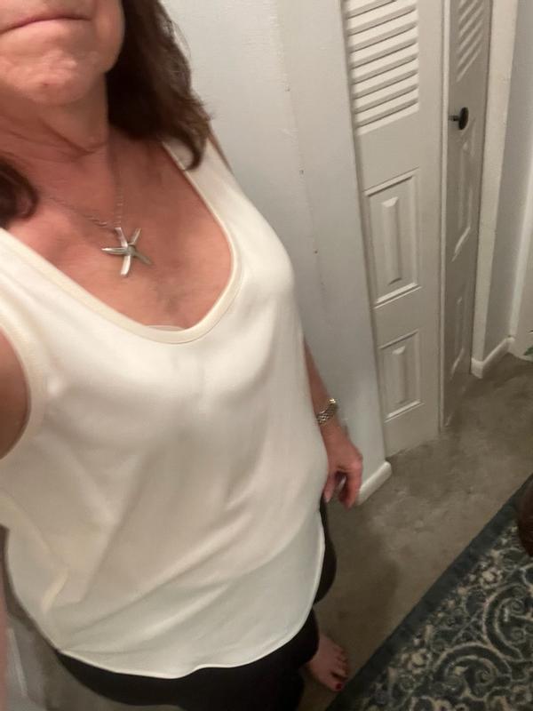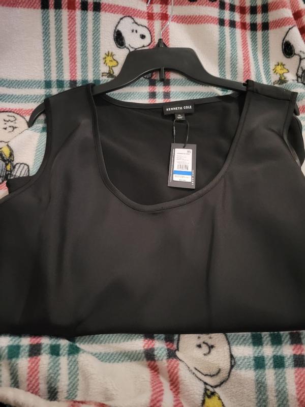 This Kenneth Cole Women's Sleeveless satin scoop neck tank top is of very nice quality. I ordered a x-large because I have a bigger chest I could have gotten a size large. I love the material it feels nice on my skin.