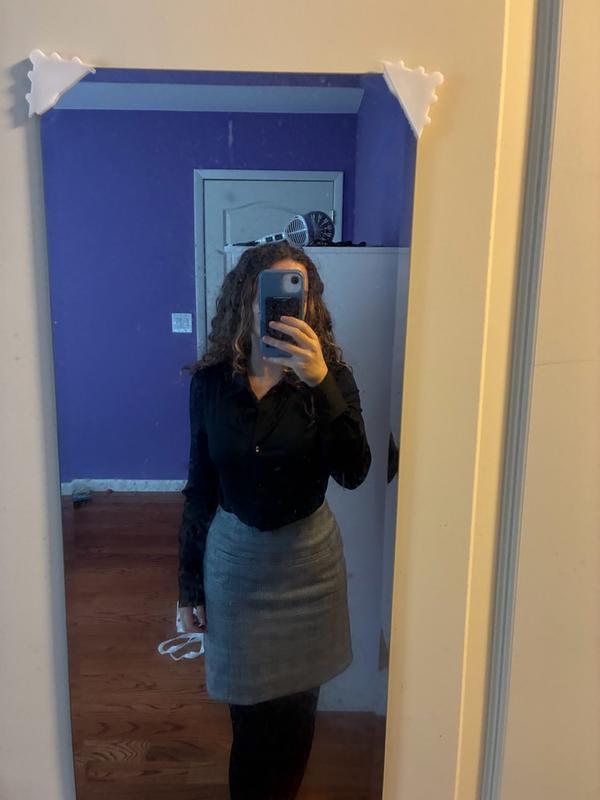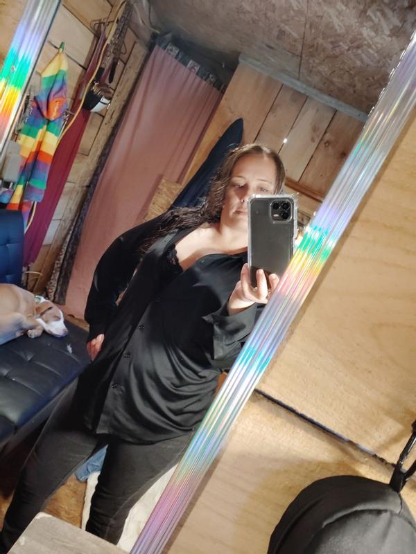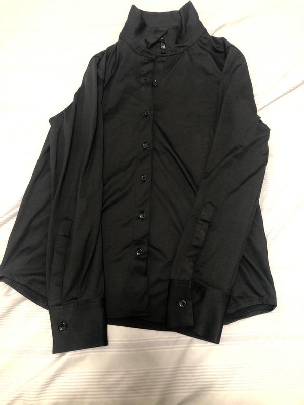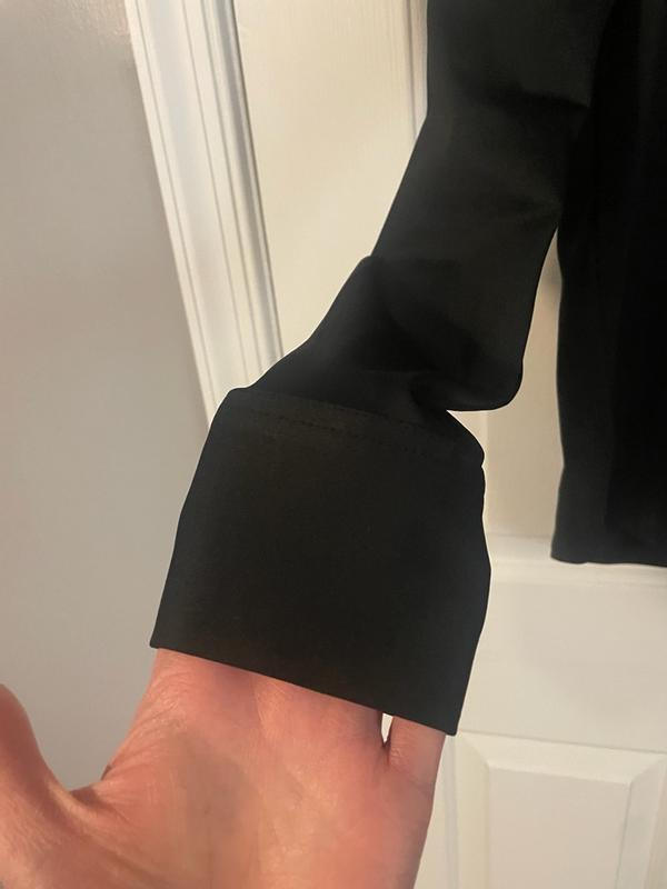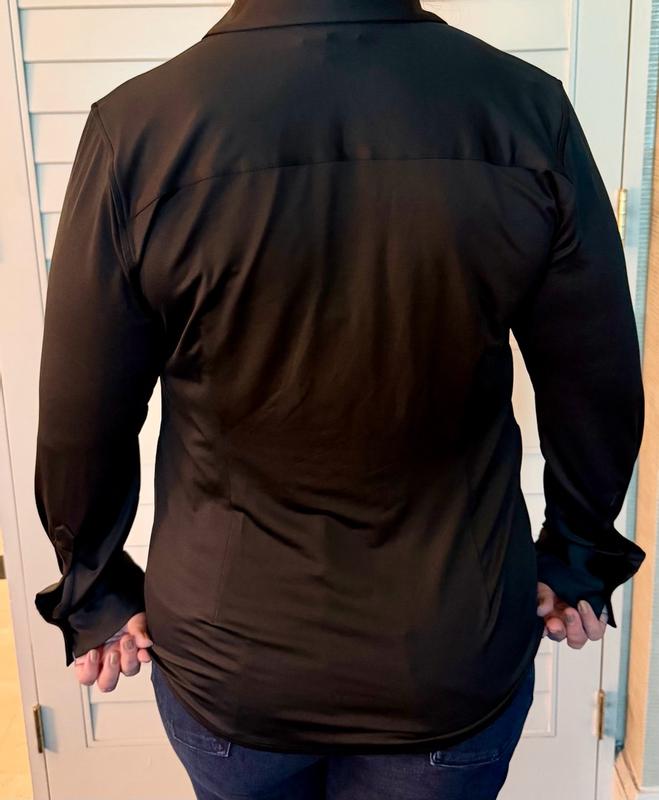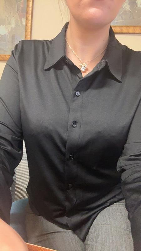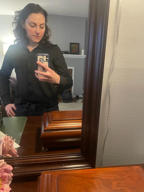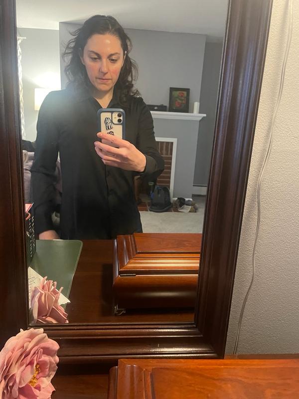 The Kenneth Cole silky shirt is so soft and has a nice stretch to it. It’s very comfortable to wear and lays nicely. I love that you can easily dress it up or down and that it’s a longer length so you can tuck it in if you want. The one thing I didn’t love is that the buttons pull a bit in the chest area so this may not be a great shirt for bigger busts. Otherwise I love this button down.