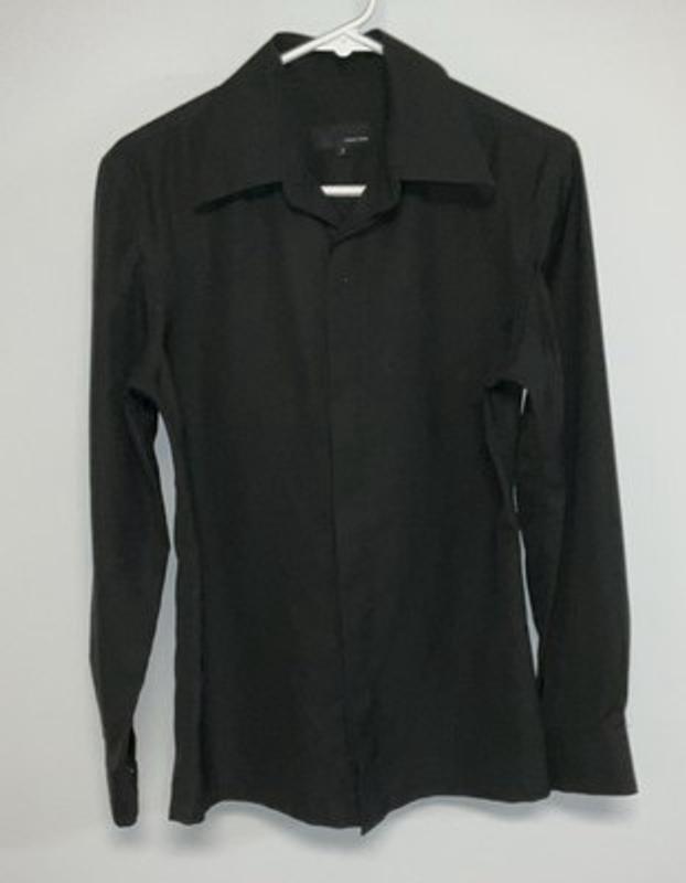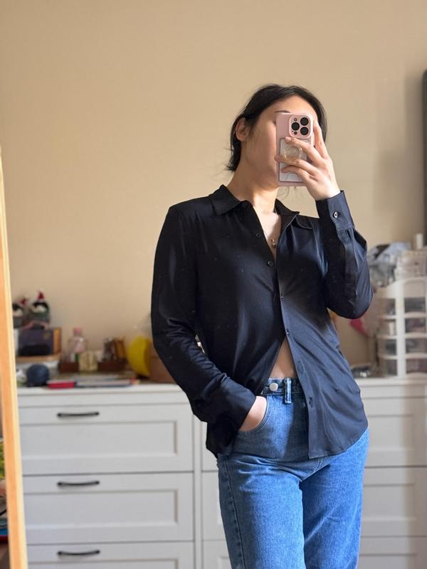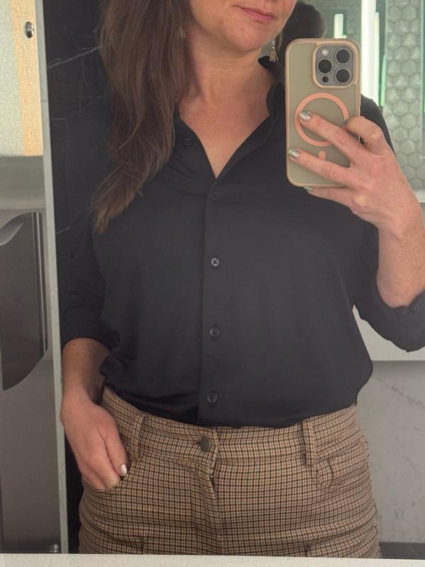 super cute black button down i van wear to work! a great staple for a capsule closet as well- really nice fabric and actually black - hope it doesn’t fade