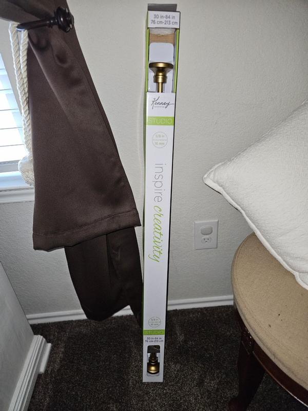The Kenney Augusta 5/8 inch Window Curtain Rod adjust from 36-66 inches to fit your window and projects 3.03 inches from the wall. For use with light to medium weight curtains in your bedroom or living room. It comes with everything you need to install the curtain rod. Love the gold finish.