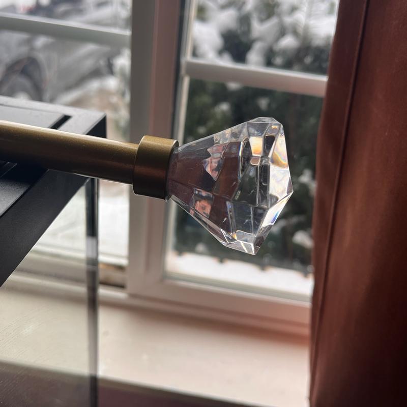 This curtain rod is beautiful! I love the color of the metal and the faceted "crystal-like" end makes it so elegant. This comes with everything you need to install, and installing it is a breeze!