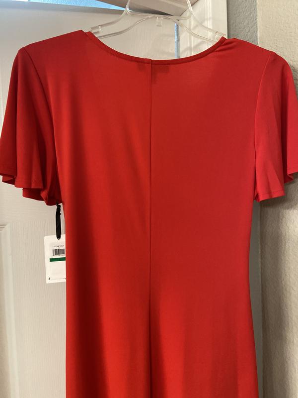 Beautiful dress. Wore to step son's wedding. Perfect length on me. Loved the rouching, which was perfect at hiding middle