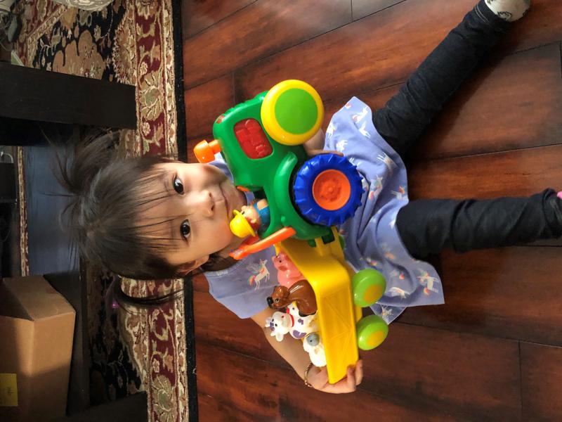 This little tractor has so much fun pa ked into it. We have played hours on end with it. You push it and the engine sounds and the animals sound when you put them in their seats. So much fun , I recommend this for your little one .