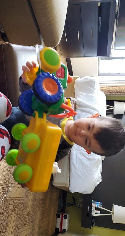 My nephew loved this toy. The farm animals are not to big or to small but just right. He loves the noise that it makes. This is easy for any kids of any age. I like the bright colors and how its light weight!