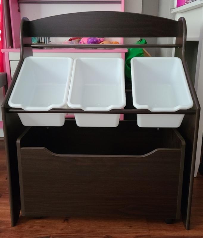 This multistorage unit is perfect for my toddler since his toys are getting out of control. We did receive a dark brown espresso storage unit which matches most of our decor. It is easy for my child to use but the white tubs seem a bit thin and flimsy. And if your not careful they do fall over.