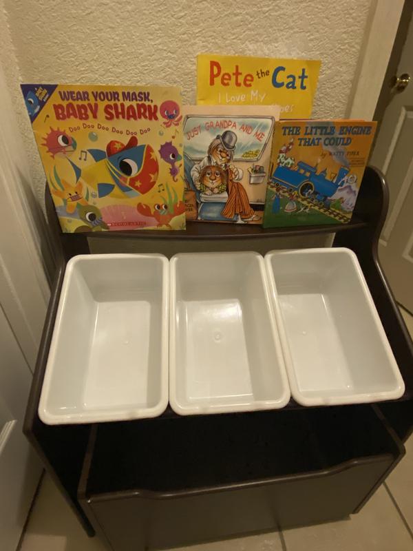 I really needed something to organize my kids play area. And this really came in handy ! It was super simple to put together, directions where very clear and to the point. I love the part on top that you can use as a book shelve. I always wanted to get a book shelve but I felt I had to settle for either a book shelve or a toy organizer because we don’t have that much space but with this one you get both ! It’s the perfect size you can swap out books every so often. I like the 3 small bins on top where you can sort out some of their toys for my kids it’s their play food , cars, and play figures/dolls. Then on the bottom I just put some of their bigger toys and stuff animals.