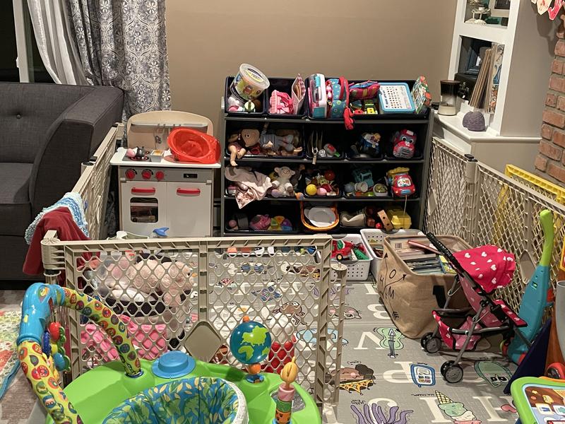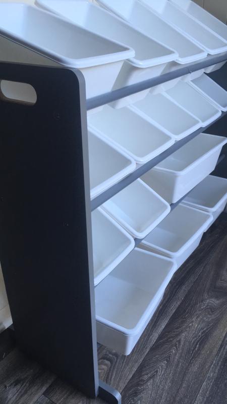 I have a 2 1/2 yr old and a 7 month old and the majority of our time is spent in our living room so naturally most of our toys are there. I had things in buckets or piles in the corner of our living room. It was driving me nuts! I like being organized, it gives me a sense of calm. I was looking for some sort of toy storage that was functional, pleasing to the eye and easy for my kids to take toys in and out. We got the 16 bin toy storage organizer and it is perfect. It was easy to put together and the construction is sturdy (it comes with wall mount supplies if you want to secure it to your wall). All my kids toys now have a bin to go in to and it has helped open up more floor space. My 2 1/2 yr can easily reach all the bins to take toys out. She actually “helped” me put the toys in to the bins when we first got it. I would (and will) definitely recommend this product.
