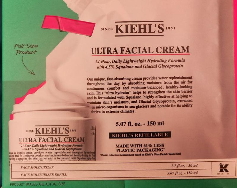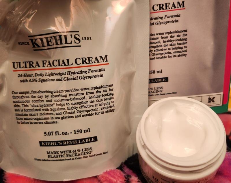 This is very hydrating for as light as it feels, no greasy feeling at all. The ultra hydrating formula is called ultra hydrating by absorbing moisture from the air, something new to me. It has a couple new ingredients I've never tried, one squalane, which says it helps maintain moisture in skin and two, glacial glycoprotein, which is extracted from micro organisms in sea glaciers, which thrives in extreme climates,so this would be perfect for a skin barrier against extreme cold. With the refill bag you get a total of 4 containers of product. I do appreciate products that have refill options. I know it says ultra facial cream, but it's nice all over and for the price for the amount you get, you don't feel bad using it all over.