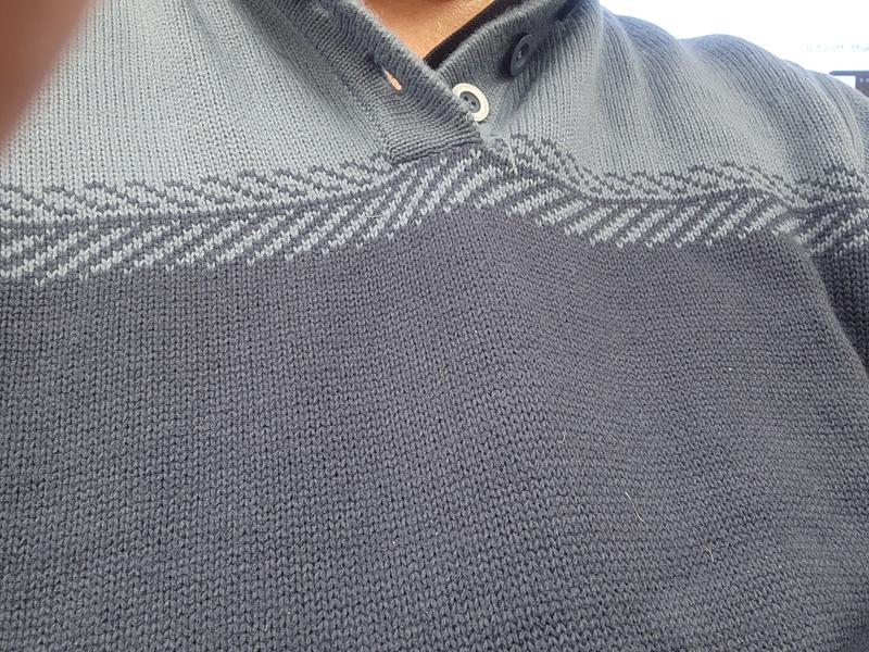 The sweater has a band of color on the top which is raised up in the middle and loks ofd and poorly constructed.