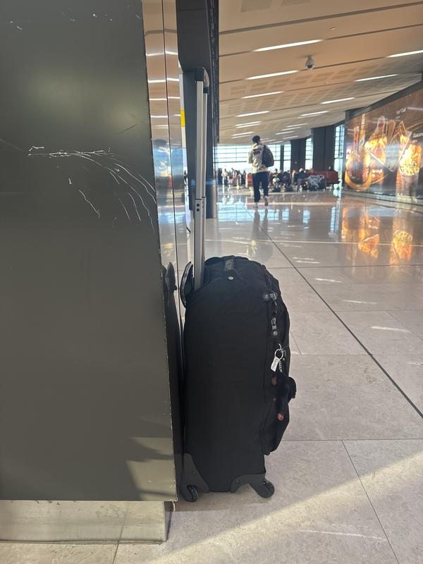 The suitcase is crooked and feels deformed. The front wheels sit higher than the back ones, so the luggage leans forward and keeps tipping over.