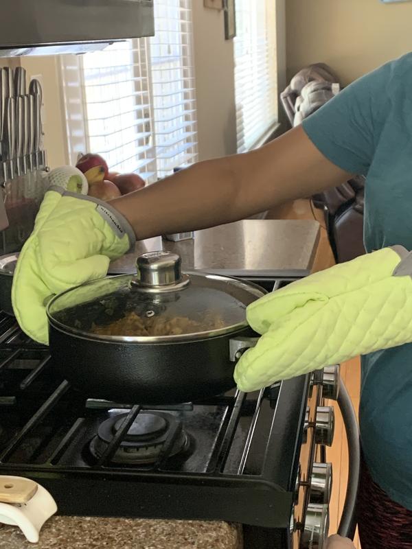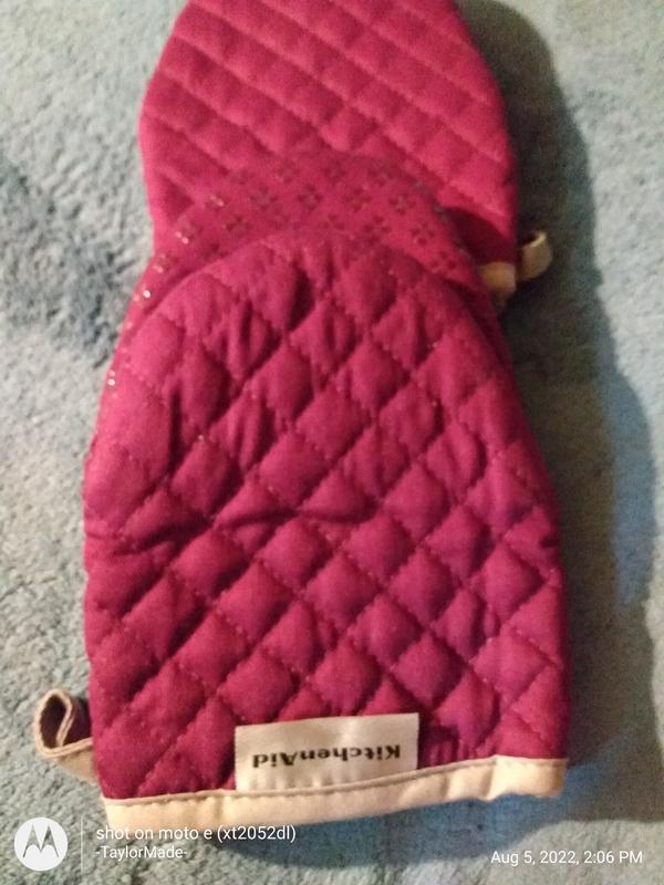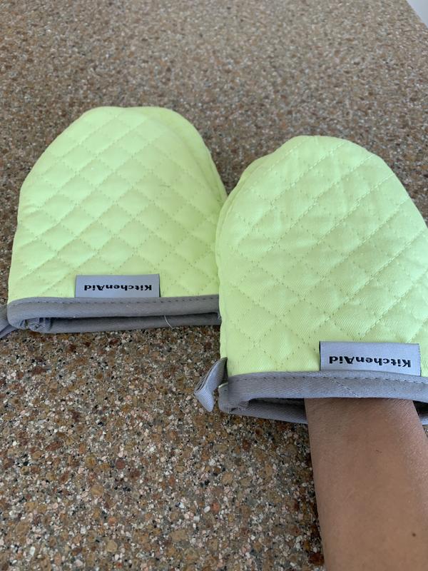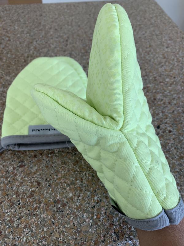 I feel like oven mitts or one of the things you do not buy very often and you don’t necessarily realize how dirty or how much you need a new pair. So I got these in the mail tossed out my old ones and use them right away getting dinner out of the oven. They’re very comfortable on the hand I didn’t get any heat transfer from the oven and they seem to stay fairly clean. I would recommend the KitchenAid ran to anyone shopping for kitchen essentials!