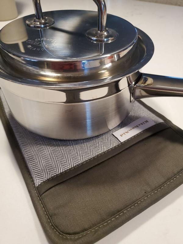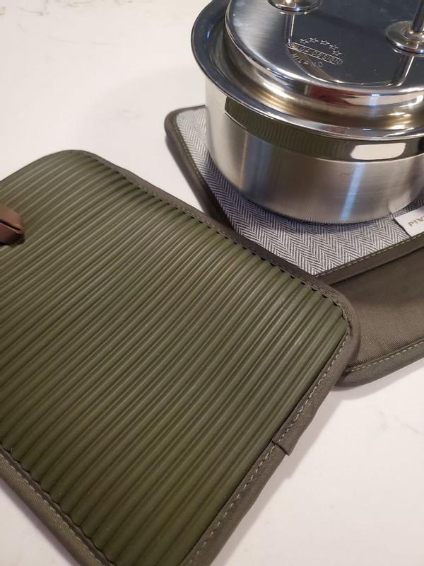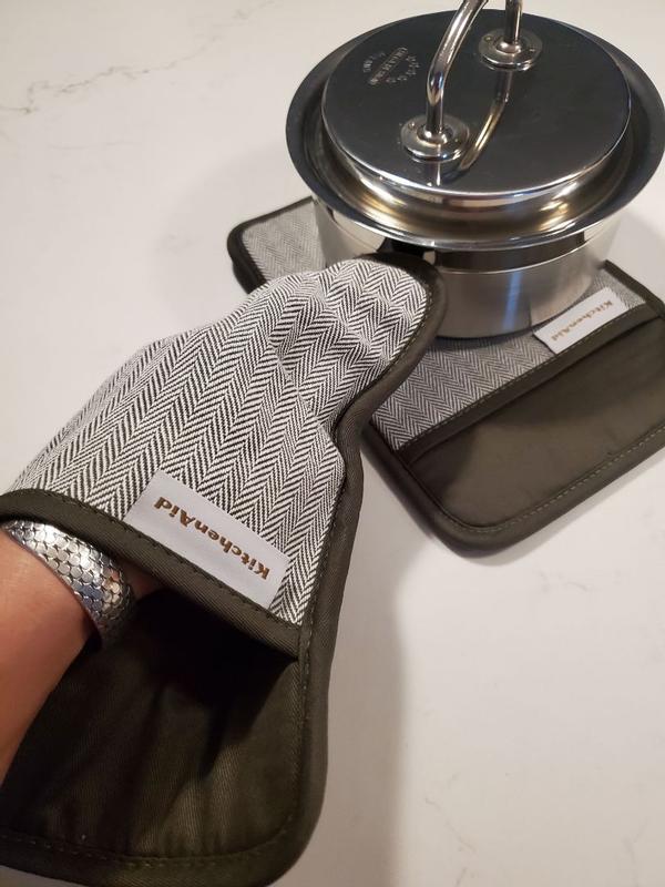 The KitchenAid Evergreen Design Series Herringbone Soft Silicone Pot Holder Set is a stylish and functional addition to any kitchen. The herringbone pattern adds a modern, textured look, while the silicone surface provides a solid grip on hot pots and pans. The material feels durable yet flexible, allowing for easy handling of kitchenware. They’re also heat-resistant and machine washable, which makes cleaning a breeze. While they’re on the thicker side, which might take some getting used to, they’re reliable and attractive, providing both safety and style for any cooking space.