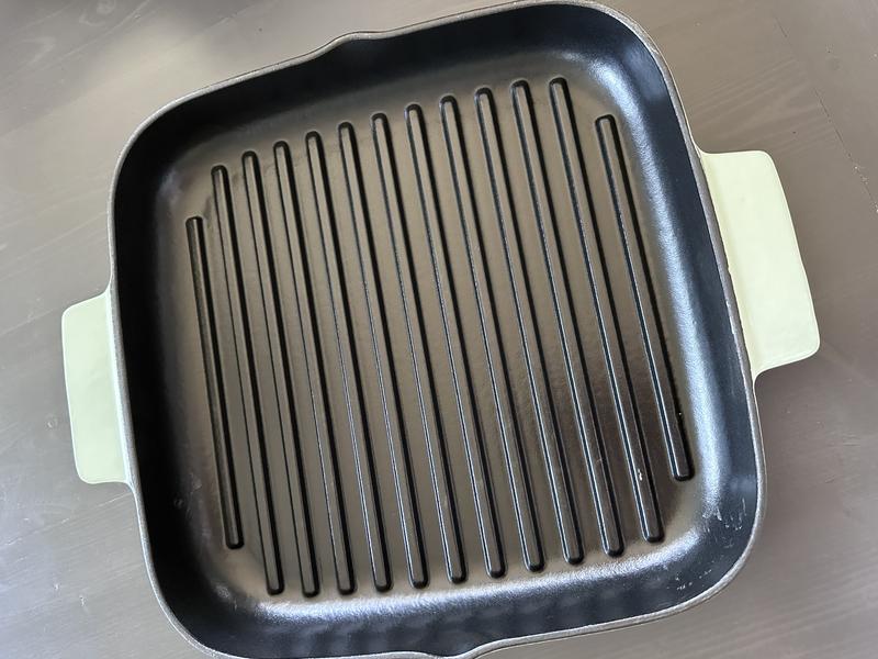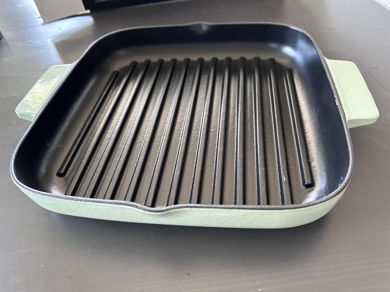 This Enameled cast iron pan is well made and is a high-quality product. It takes no time to clean after use. I love the finish and the color. Grilling burgers are definitely better now. I've used this pan 3-4 times and it still looks new.
