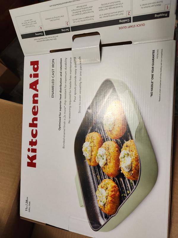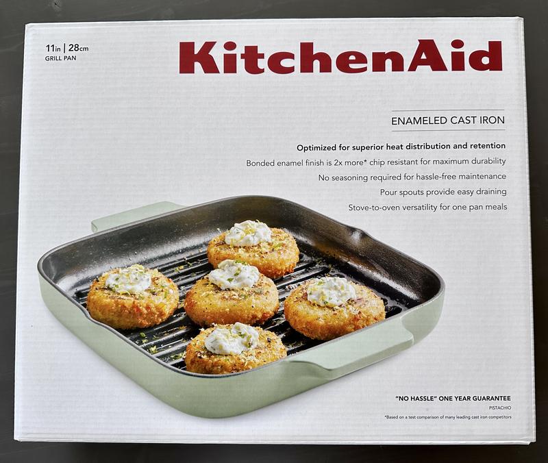 I thought the KitchenAid 11 inch Enameled Cast Iron Grill Pan would be a great addition to my kitchen. For myself, this is not the case. There are too many "don't do's" or "be careful's" to make using it easy. It does grill and bake very well, and I loved the crispy bacon that I made on the grill! The pan itself is super heavy. You really can't remove it from the cabinet or the oven with one hand without almost dropping it. It also warns you that it may scratch counter tops, metal sinks, and ceramic cooktops. There always needs to be a potholder, dish towel or trivet nearby in order to prevent this. When you use the grill pan in the oven, it may get so hot that you also can't take it out of the oven and put it on a cold ceramic cooktop without the risk of shattering the cold surface. Maybe all cast iron pans and skillets are this way, it just doesn't work well for me. I am always looking to make my cooking quicker and easier, whereas this makes it a bit more difficult for me. Some of you may be absolutely ok with this and/or use to this while cooking, so the pan may be a welcome addition to your collection. The grill pan itself is beautiful, cooks well, and comes in several different colors of enameled finish! You will have to decide which features and warnings fit in your own cooking pro and con columns.