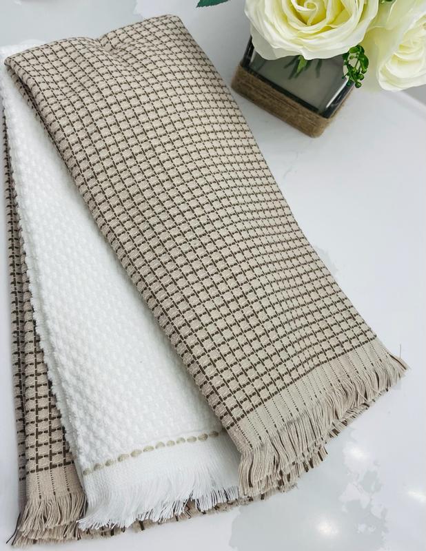 I like the design, it’s simple, and made with 100% cotton. I received the set of 3 brown and white towels, and I personally love the white one. And the quality is better than my current one for sure.