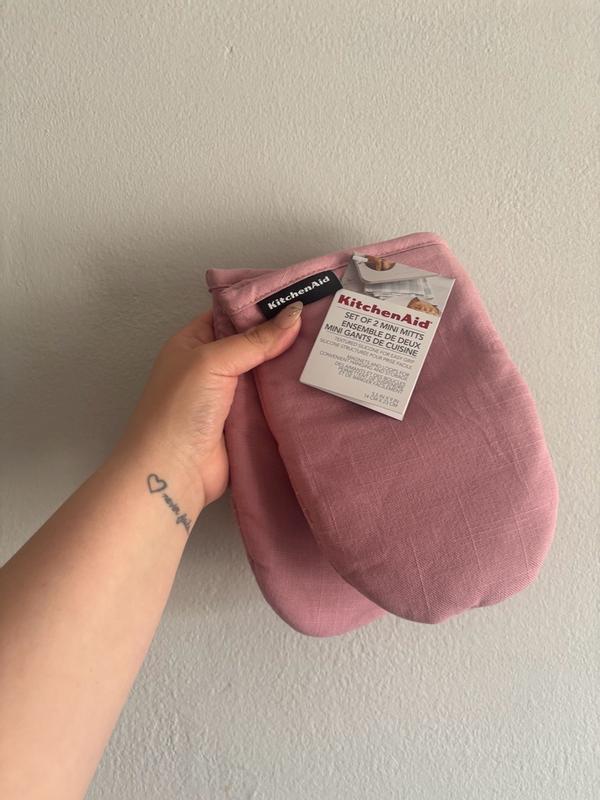 These Kitchenaid mini oven mitts are great. I love the color and the size. Excellent quality. They are perfect to keep my hands from burning when I’m baking but they don’t go so far up my arm.