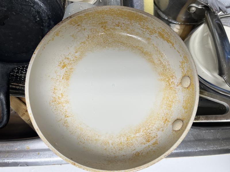 I used the smaller one on weekends for eggs, and it worked great. One night, I used it to simply heat tortillas, and now it is heavily stained even after soaking all night in Dawn soap. KitchenAid was not very helpful and passed me over to their pan dealer. My window to return this to Macy's has closed.