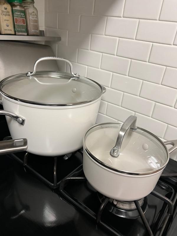 Great set and such a cool color. Gives a retro feel. The lids are interchangeable. The ceramic is a great non stick option .