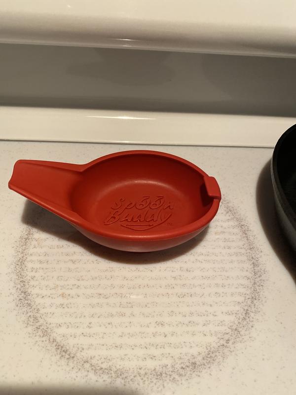 The Spoon Buddy is a spoon rest with a suction cup at the base that allows it to be adhered to the top of lids, countertops, or tables to provide a convenient place to rest your messy utensil. It can also be flipped over to help open jars and can turn a plate into a lid for a frying pan