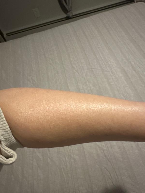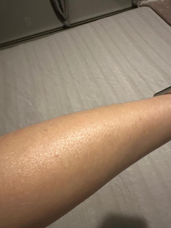 This is wonderful, dewy and with such a slight shimmer it looks like your skin is lit from within. Gives a hint of tan look on my arms & legs as I have a very fair complexion. The sunscreen properties (SPF 30) are perfectly non irritating. The scent is delightful and not overwhelming after the waiting time as for all sunscreens. The scent is coconut with a hint of cinnamon. Did you know the most loved scent by men is cinnamon rolls? Hahaha! Enjoy!