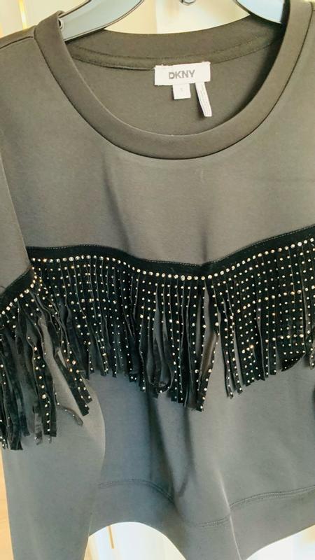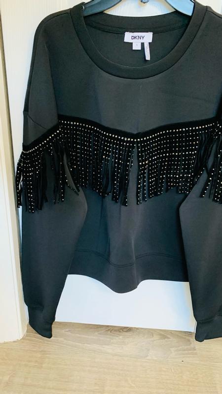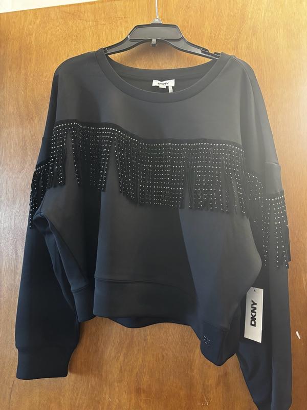 I am just in love with this black dkny classic sweatshirt; all thanks goes to the studded fringe design it has. It has crew neck with long sleeves with dropped shoulders with soft material which makes it very comfortable to wear. This is a weekend perfect pullover with swingy fringes. Mostly its fabric is polyester. It is true to the size, I am size 4-6 and got the size Small and it just fit me right. This is gonna be so perfect in the coming holiday season. It is a good quality and durable pullover. It can be matched with any type of jeans and roam in style.