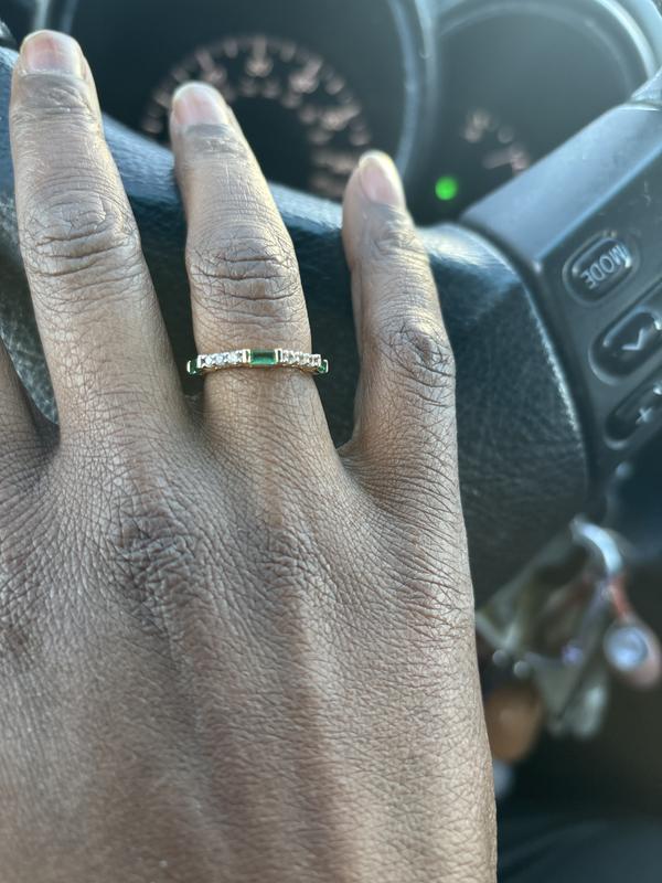 Love this ring it is simple yet elegant. It is lightweight and is easy to wear. I enjoy looking at the clear emeralds and the sparking diamonds.