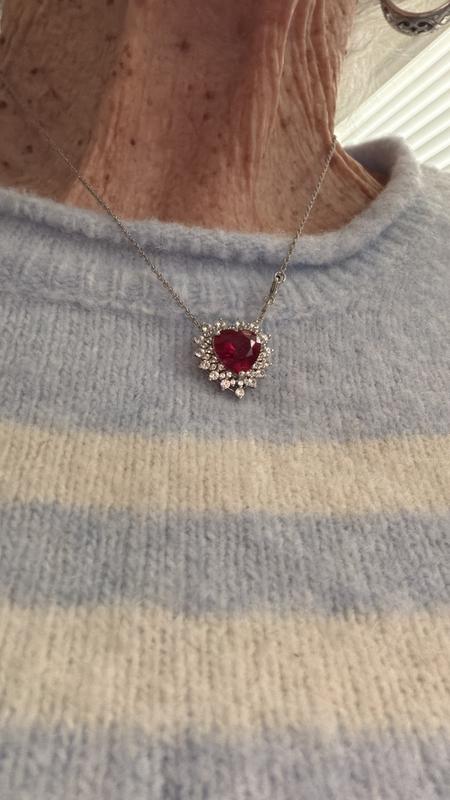 I was looking for a good size ruby necklace for my sister. This was such a pleasant surprise. I love that Macys shows a picture of someone wearing it. It definitely helps to get a good perspective on size. It’s beautiful! Such a lovely piece of jewelry. My sister loved it!