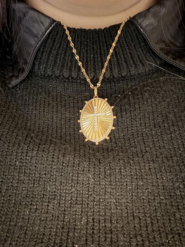 I treated myself to this necklace using my holiday bonus, and I couldn’t be happier with my choice. The pendant has a beautiful shine and catches the light perfectly without being flashy. The size is just right delicate enough for everyday wear, yet still meaningful and noticeable. My previous cross necklace from my confirmation recently broke, and this piece exceeded my expectations as a replacement. The oval medallion design feels elegant and timeless, and the lab-grown white sapphire adds a lovely sparkle. It feels special, well made, and comforting to wear. This necklace has quickly become one of my favorite pieces, and I would highly recommend it to anyone looking for a beautiful, faith-inspired necklace with great quality and shine.✨