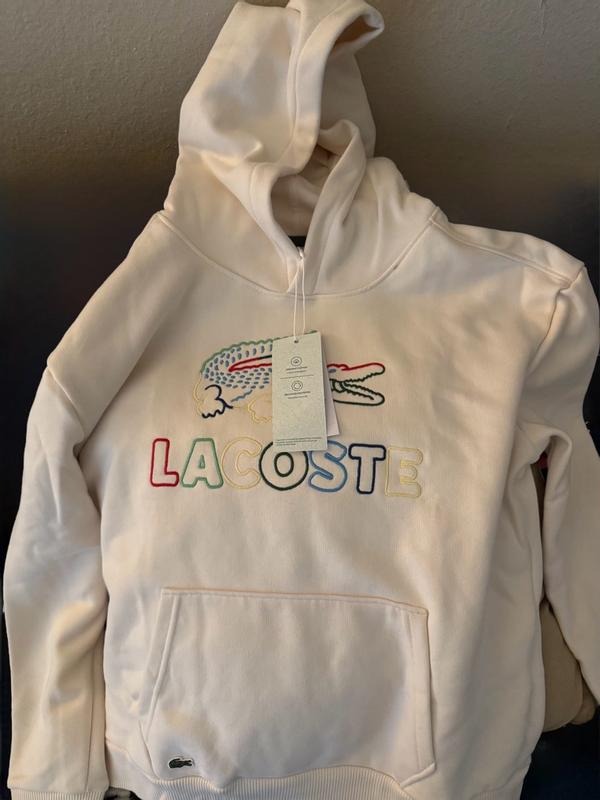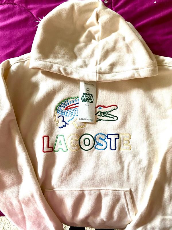 This is a great hoodie. It is really high quality and a nice item to have. The design on the front looks very bright and colorful. The inside of the hoodie is super soft and warm. The actual hood itself is roomy also. I like the big pocket that it has and the little detail of the Lacoste alligator on the front. It washes and wears very well and fits true to size. It’s perfect for the chilly weather we’ve been having lately.