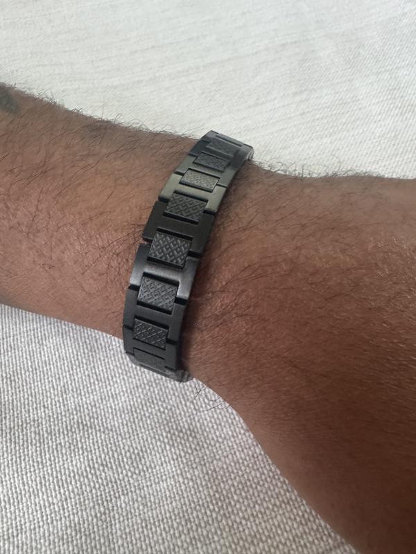 This men’s bracelet is a sleek statement piece and a timeless accessory to compliment any style. The bracelet is easy to put on, the clasp is secure and heavy enough to feel secure, but light enough to not be too heavy on the wrist. My husband loves this bracelet!