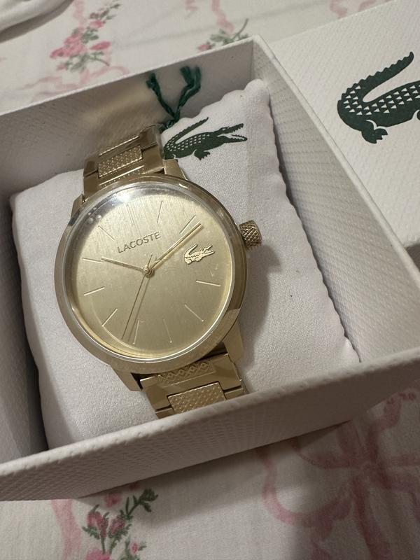 I’m in love with this gorgeous men’s all gold toned Lacoste watch! It looks very expensive and is very comfortable to wear. I easily had two links removed to fit my wrist. The Lacoste crocodile is on the face of the watch, on the pin that sets the time, on the back of the watch and on the clasp. All nice touches! The band is also beautiful and catches the light nicely. The watch comes in a nice box with a watch “pillow”. Classy packaging. I highly recommend this watch.