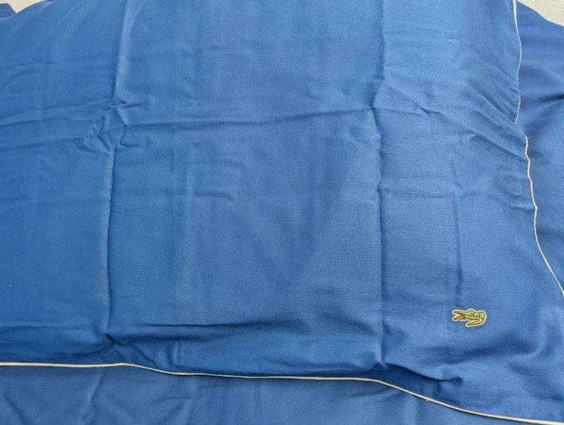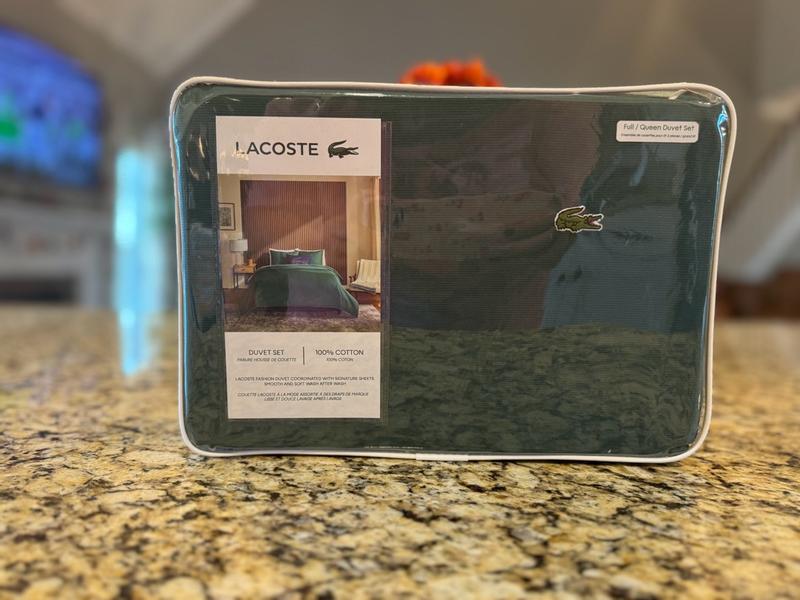 This is a high-end 100% cotton duvet set that comes in a gorgeous rich blue to accent any bedroom decor. There are two shams elegantly embroidered with the famous Lacoste logo. The duvet cover easily accommodates a queen size comforter (may be a bit too spacious for a full size comforter), and it has a button enclosure (which in my opinion is easily superior to the zipper enclosures that so easily break). The external surface feels sturdy and durable, but the underside that touches your skin is smooth and silky. My bed looks so beautiful! Now I wish I had bought some new sheets to match.