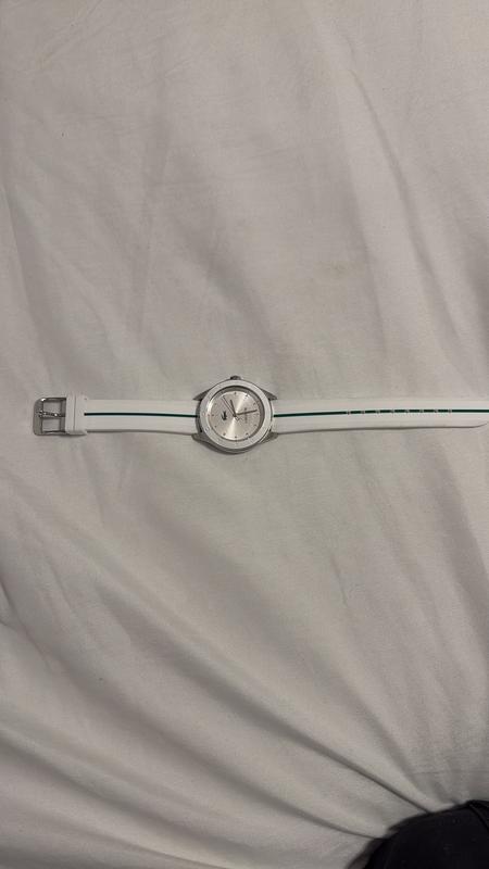 This watch is very beautiful. The iridescent bezel with the subtle Lacoste writing puts it over the top. I have a small wrist but this fit is perfect. I love the white color, small green stripe on the band and of course the animal logo.