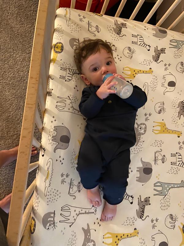 This sheet is so nice, it is like that stretchy soft T-shirt material that is just so comfy. It’s perfect for those colder months. The design I have is the jungle print and it’s really nice and gender neutral some very pretty yellow is grays and blues. I actually like this fitted sheet better than my more expensive ones for the baby. It’s just a great little sheet. Fits well on any standard crib mattress.