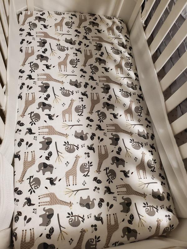 I am loving the pattern since my son's room has an elephant theme and the sheet fits tightly on the mattress as it is supposed to for safe sleep practices. I wish the sheet was a little softer though.